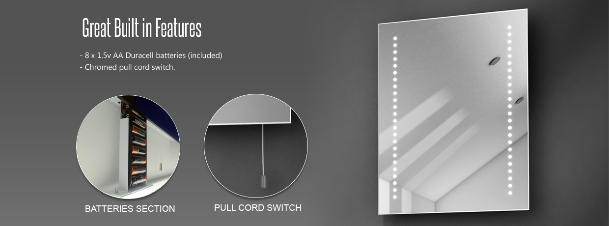 Our LED Battery mirrors come with batteries included and are operated with a simple pull cord switch.